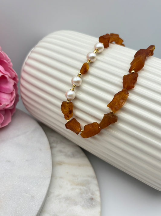 Bernstein, Süßwasserperlen, Sterlingsilber S925/18K vergoldet